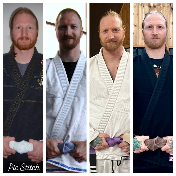 Watched UFC1 on VHS and wanted to learn Jiu Jitsu. Started Japanese Jiu Jitsu in 1999; Gracie Jiu Jitsu was non existent where I lived at that time. My first belt promotion to yellow belt was 2001