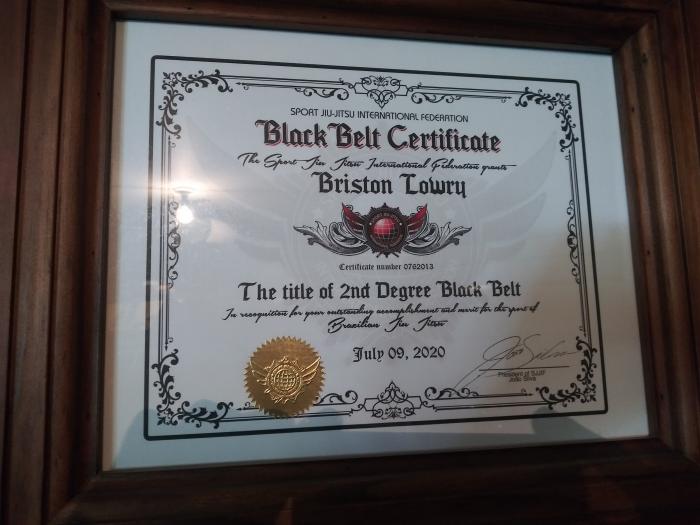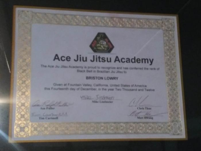Lineage: (Gracie Jiu Jitsu) Mitsuyo Maeda > Carlos Gracie > Helio Gracie > Royler Gracie > Cleber Luciano > Tim Cartmell & Mike Lindmeier > Briston Lowry (Classical Jujutsu) Seishiro Okazaki > Raymond Law > William Randle > Micheal Chub > Len Riley > Ron Thomas > Briston Lowry (Taiho Jutsu) Sokaku Takeda > Ryuho Okuyama > Joseph Miller > Tony Pacenski > Briston Lowry