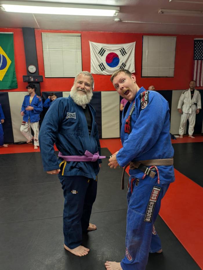 I got promoted purple at a no Gi class. We had been working on chokes and D’Arce entries. Bo had me go into a tight turtle then choked me with my new belt. You can tell in the one pic how happy and surprised I was.