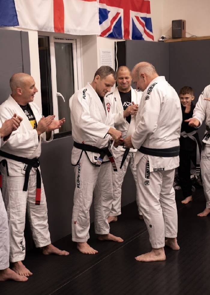 I had been training in Japanese Jiu Jitsu since 1984 - started self training BJJ with a couple of training partners from TJJ. Got awarded my Blue belt from Royce at a seminar we held in 2001 - Started again with Colin Howells at White belt in 2011 - Had to move teams in 2016 as Winchester BJJ closed down. Went to Alton BJJ with Brian Livie under Andy Roberts who I had the pleasure of meeting when he was a Purple belt up in Sheffield. Have stayed with the Team ever since.