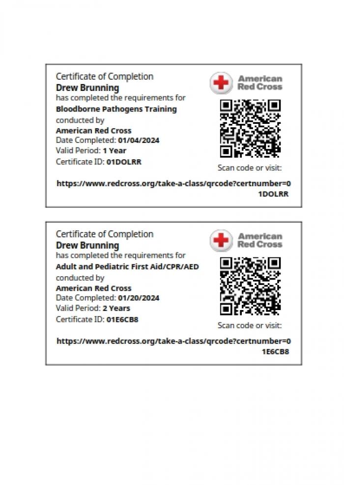 Red Cross CPR, AED, First Aid, and Bloodbourne Pathogen Certifications