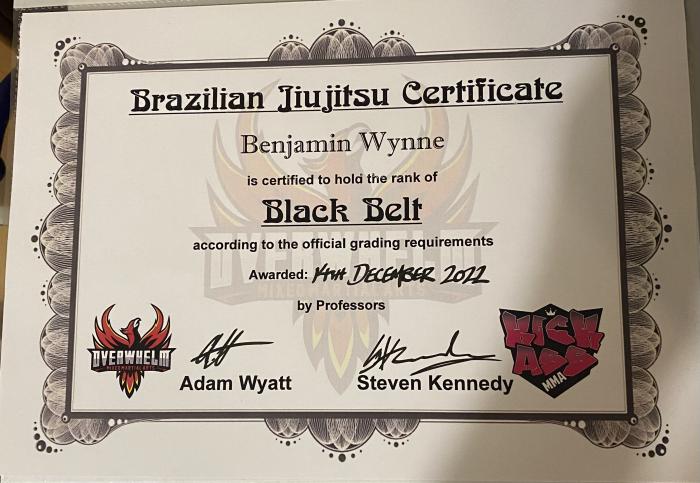 BJJ black belt from Western Australia. I started my martial arts journey at Overwhelm MMA in 2011 (Wyatt's MMA at the time) and have achieved a TKD black belt and had 6 amateur MMA fights. I started training BJJ under Fabio 'Coringa' Nunes & Adam Wyatt and now train under Steve 'Steamrolla' Kennedy & Adam Wyatt. I love teaching and learning and the BJJ journey provides plenty of opportunities for both! Mitsuyo Maeda > Carlos Gracie Sr. > Helio Gracie > Carlos Gracie Junior > Jean Jacques Machado > John Will > Adam Metcalf > Steven Kennedy > Ben Wynne