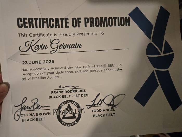My name is Kevin Germain. I have been training in Brazilian Jiu-Jitsu for over two years at Parabellum Martial Arts, continuously sharpening my skills on the mats. In addition to BJJ, I train in Taekwondo, Hapkido, Judo, blending these disciplines to refine my martial arts journey. With 19 years of dedicated service in the U.S. Army, I remain committed to both my military career and my passion for martial arts, always striving for growth and excellence.