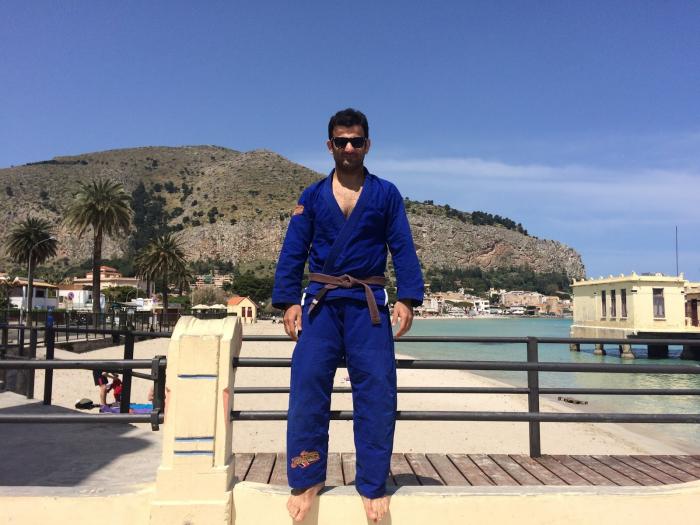 My first meeting with a Jiujitsu black belt: Mr Roy Harris. Wearing my karate blue belt and a judo jacket I had borrowed. (2003?)