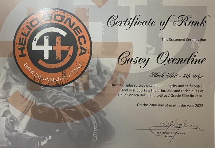 Awarded Black Belt by instructor Helio “Soneca” Moreira during a seminar hosted at Team Oxendine Martial Arts